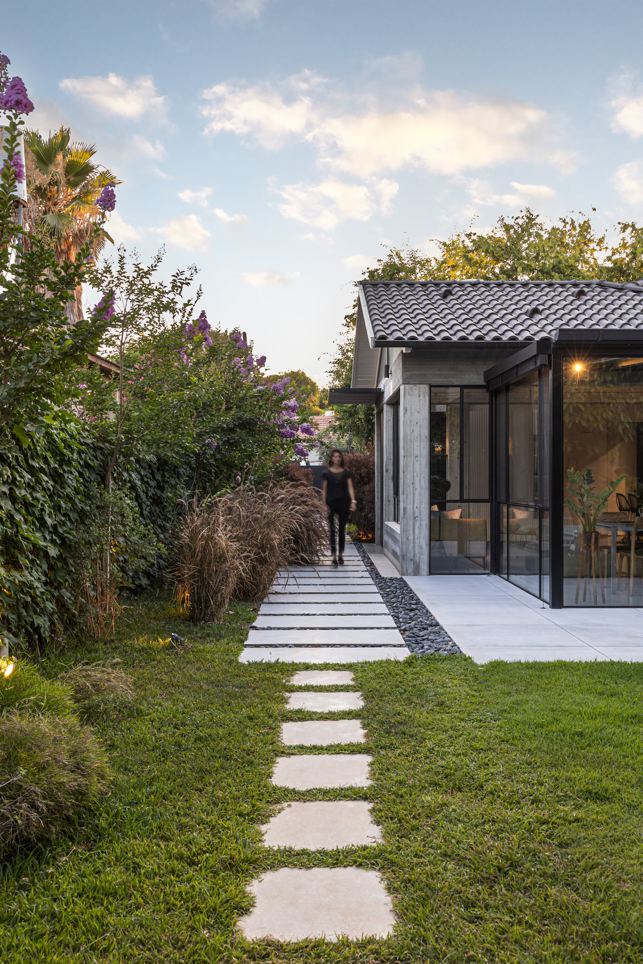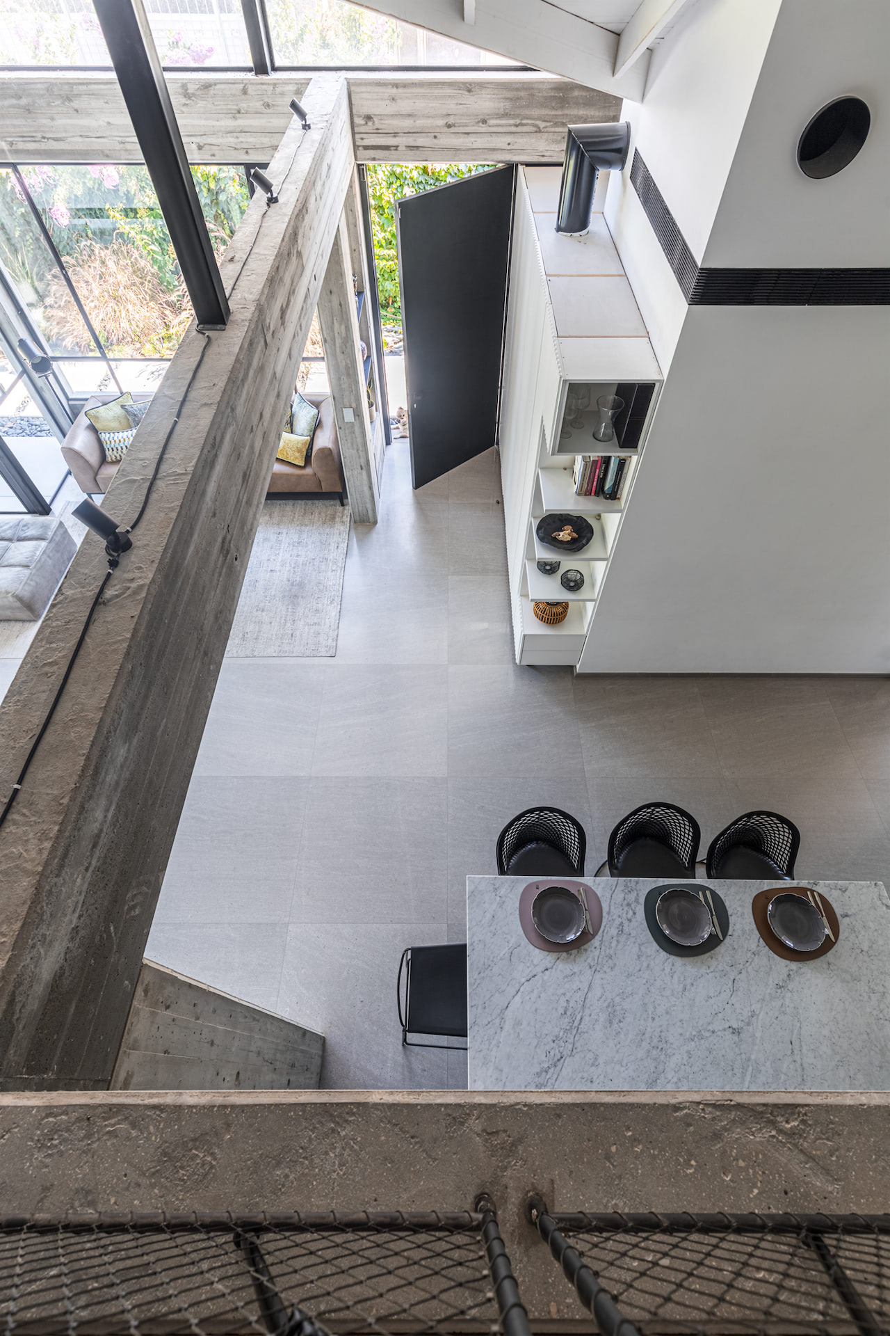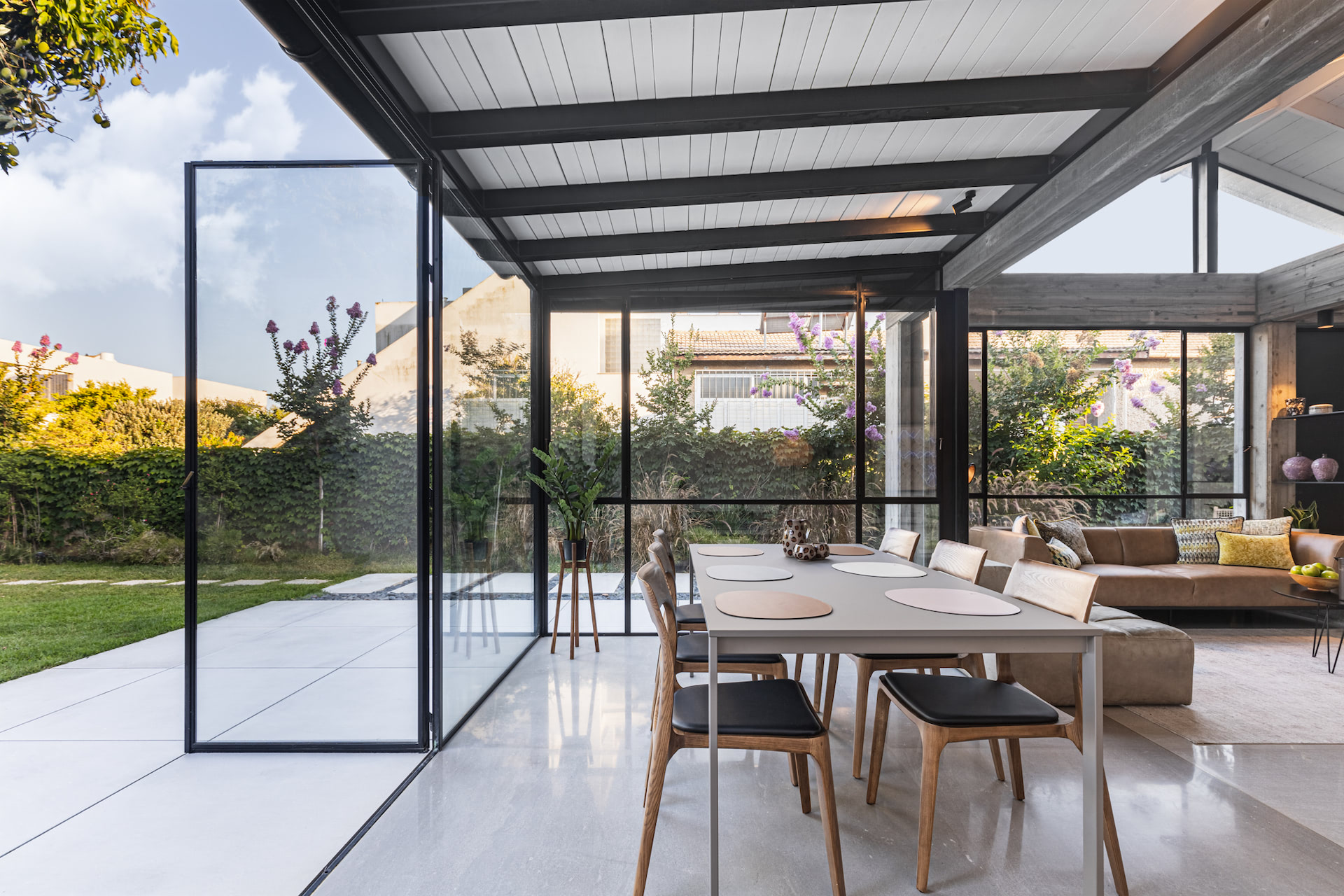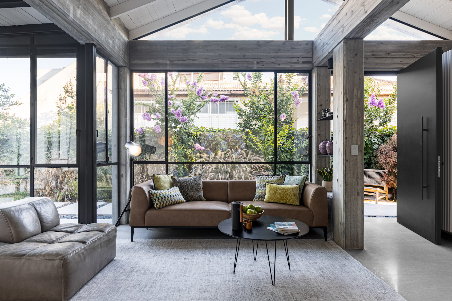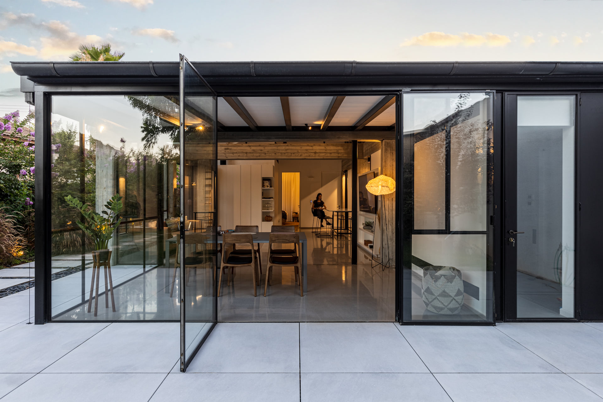 בית פרטי במרכז הארץ מודרני ומינימליסטי עשוי כולו מחומרים טבעיים, בטון חשוף וחלונות בלגי ברזל שחורים ברמת גימור גבוהה במיוחד.
